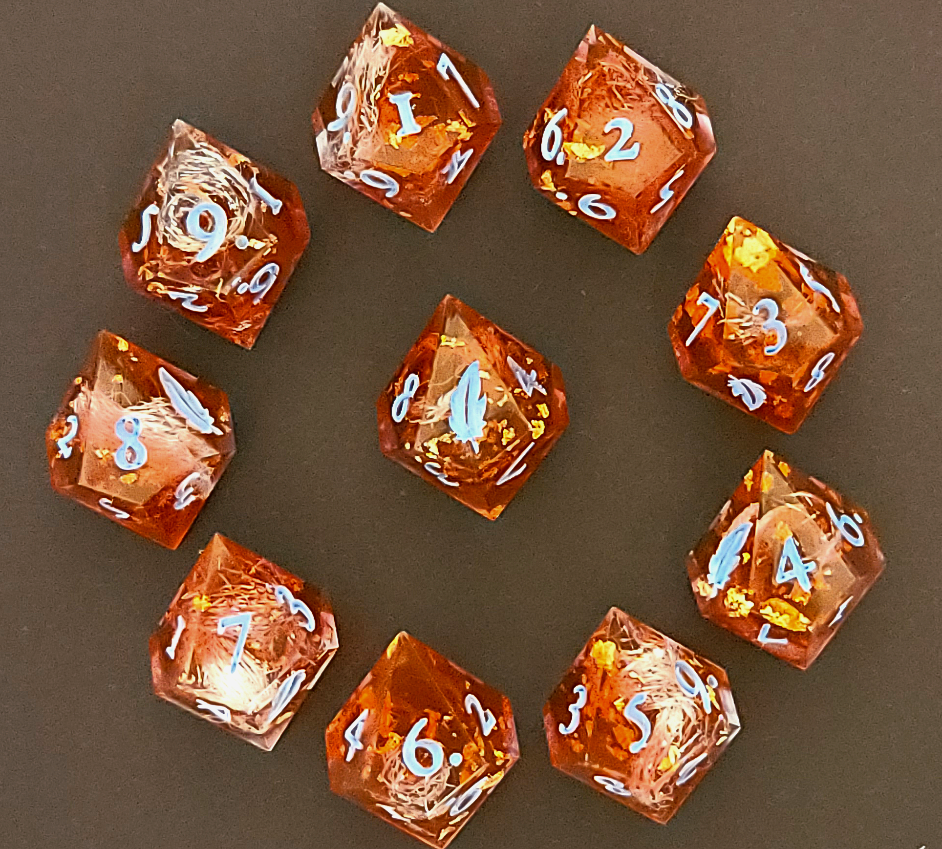 These resin dice and any custom inclusions are handcrafted in-house; there may be small imperfections including but not limited to micro scratches, micro bubbles and inclusion surfacing. I will do my best to accurately picture any egregious flaws.