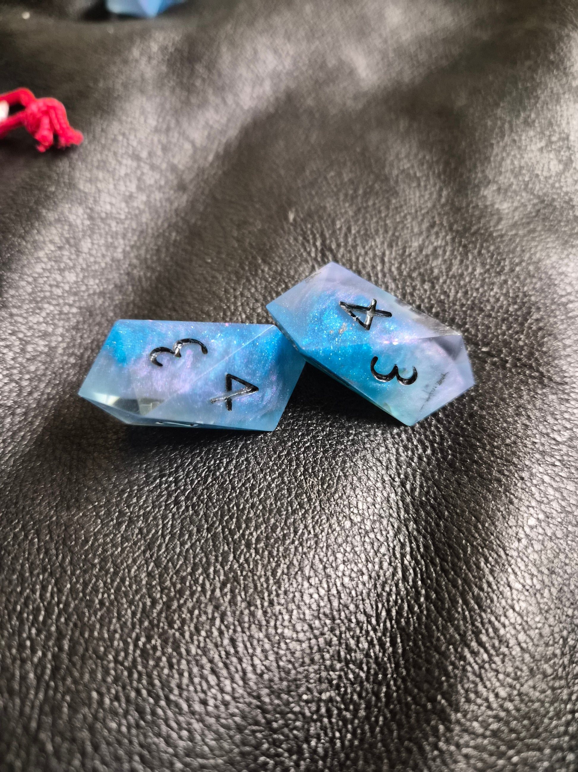 These resin dice and any custom inclusions are handcrafted in-house; there may be small imperfections including but not limited to micro scratches, micro bubbles and inclusion surfacing. I will do my best to accurately picture any egregious flaws.