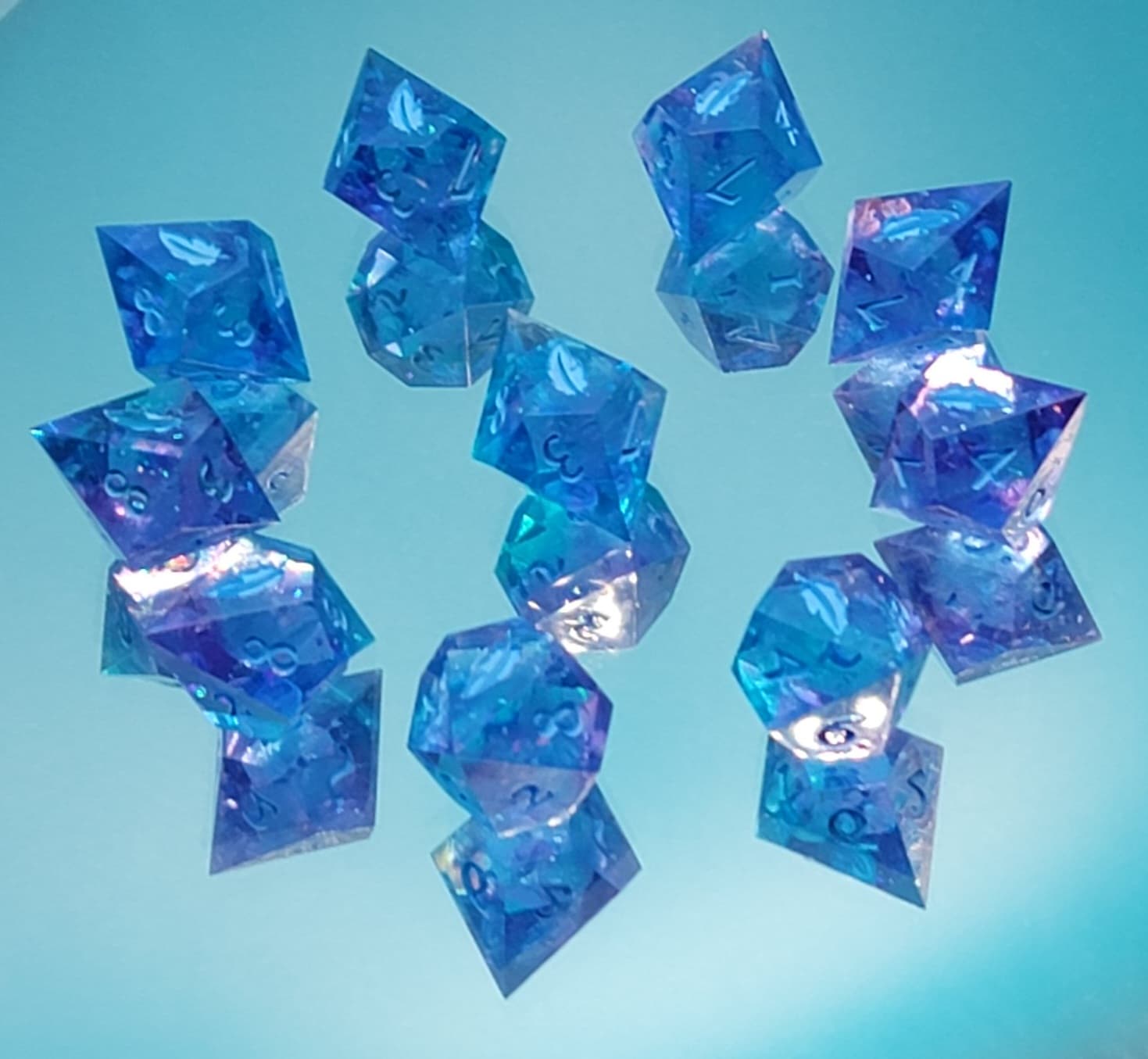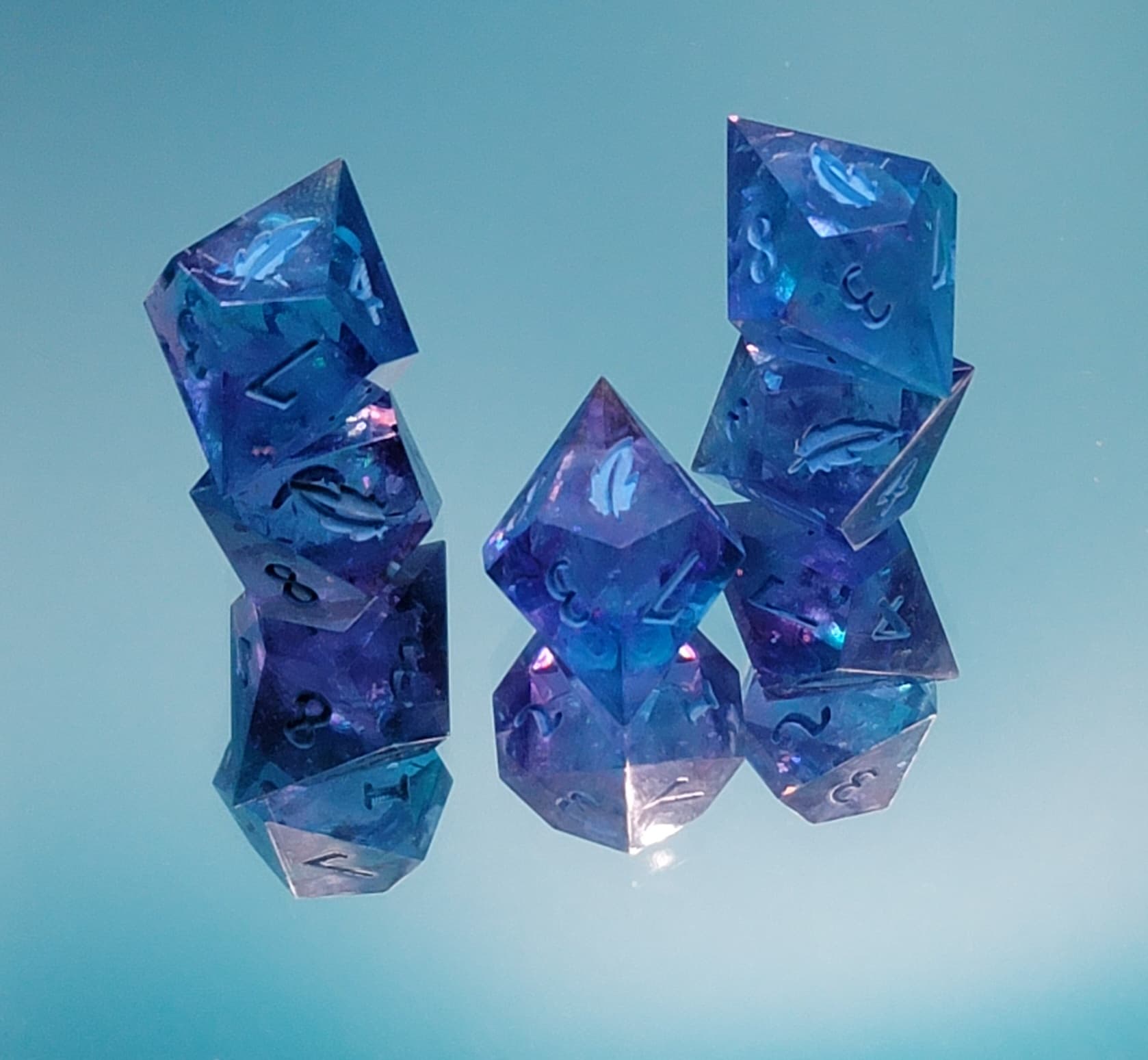 These resin dice and any custom inclusions are handcrafted in-house; there may be small imperfections including but not limited to micro scratches, micro bubbles and inclusion surfacing. I will do my best to accurately picture any egregious flaws.