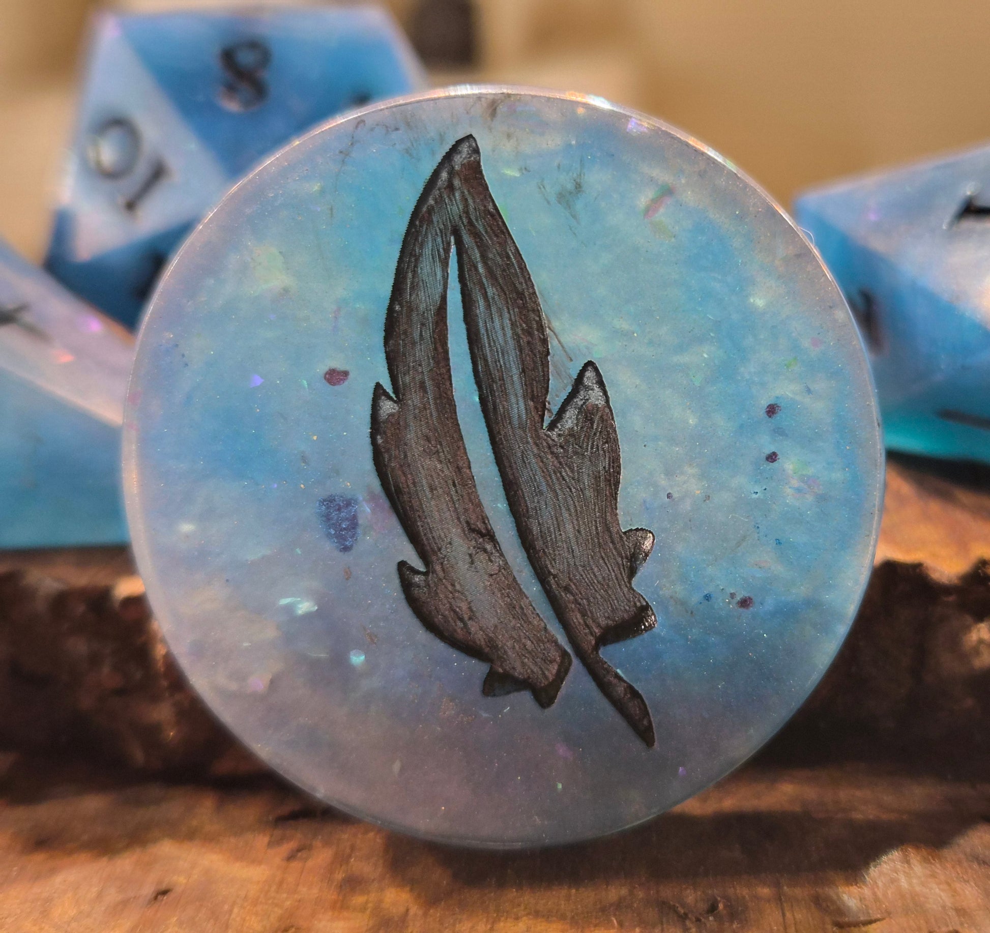 These resin dice and any custom inclusions are handcrafted in-house; there may be small imperfections including but not limited to micro scratches, micro bubbles and inclusion surfacing. I will do my best to accurately picture any egregious flaws.